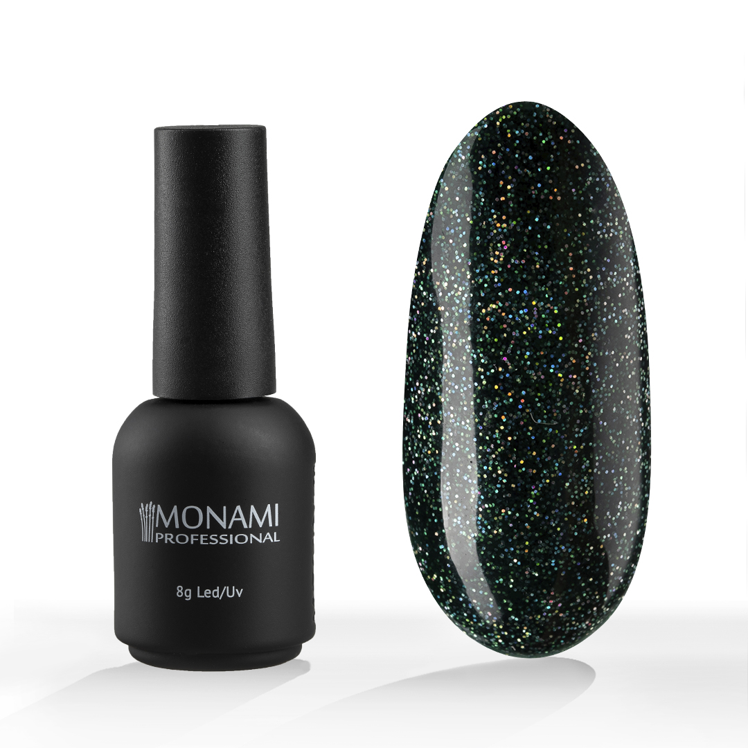 Гель-лак Monami насыщенного зеленого цвета с большим количеством голографических блёсток, средней консистенции.